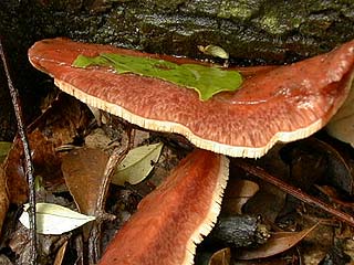 これは別の木に出ていたカンゾウタケ。場所は太い根っこと地面の間である。ナイフで切ってみると、断面はシモフリ肉のようだ。下部の白っぽいのは管孔で、この部分を包丁で削ぎ落として調理する。