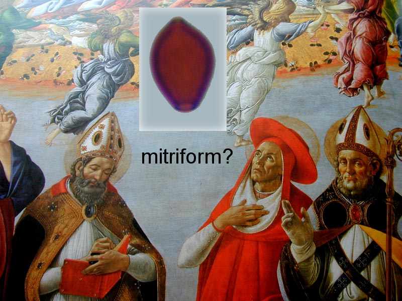 尖帽は英語でmitra(ミトラ)といい、司教がかぶるとんがり帽子のことである(上の絵を参照)。このとんがり帽子のかたちを「mitriform」といい、「僧帽形」とも訳される。余談ながら、胞子は通常、発芽孔を上に向けて描かれる(上の絵では逆)。なので、海外の図鑑では「逆さミトラ形」みたいな表現もみられる。